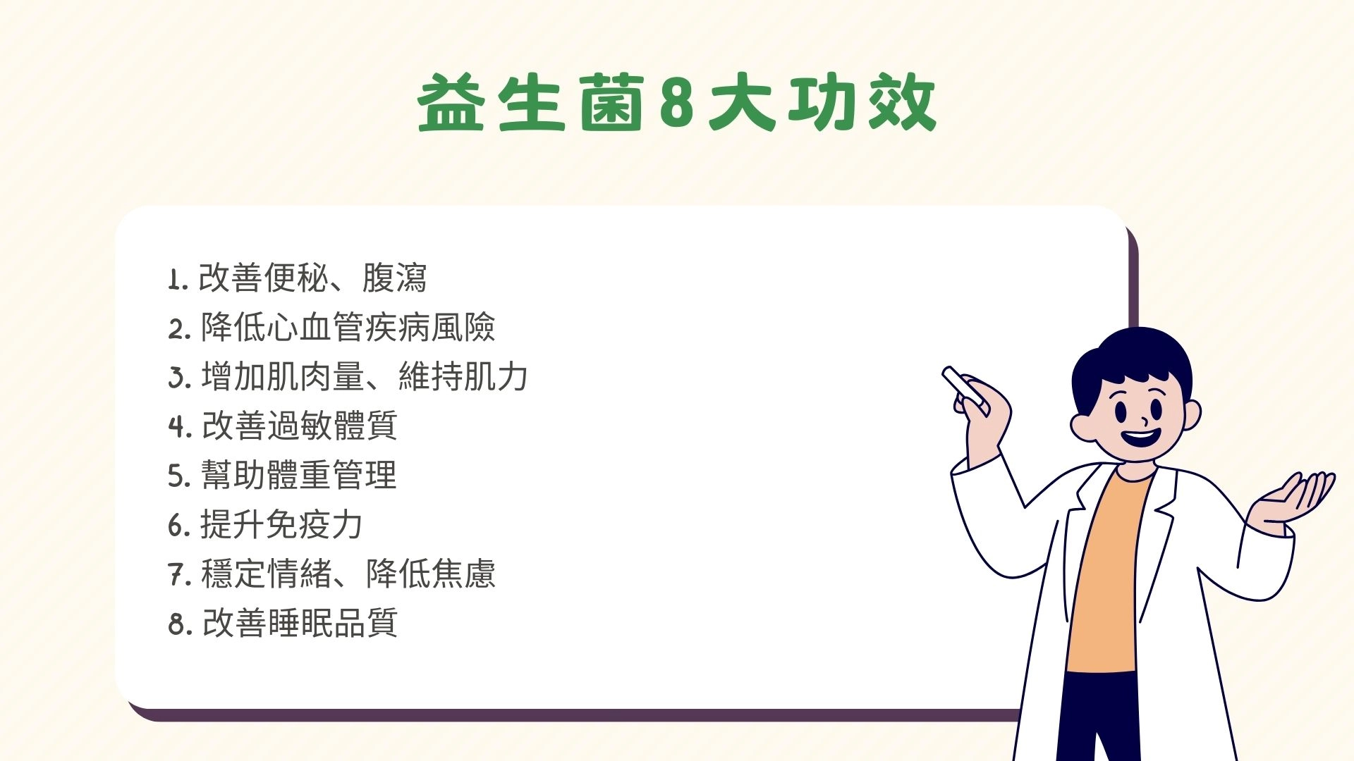 以下整理出8項經研究支持的益生菌功效與建議族群:
